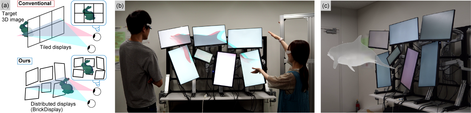 Figure 1 (a) Top: A diagram of a traditional Tiled Display, which requires a grid of identical monitors. Due to the bezels obstructing the view, these displays were limited to showing 3D content that appeared behind the screen. Bottom: In contrast, our BrickDisplay uses a sparse, irregular arrangement of mixed monitors to create a 3D aerial image that pops out in front of the screens. (b) The physical BrickDisplay setup. (c) The resulting 3D image as perceived through anaglyph glasses. |